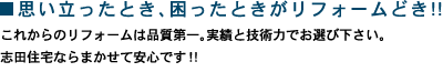 | 志田住宅は、ご家族構成・ライフスタイルに合せて『設計力』、『技術力』、『提案力』でお客様の 夢や希望にお応えします。 “資金計画“から“ご入居後の暮らし“までお客様の安心を目指してサポートをいたします。 |